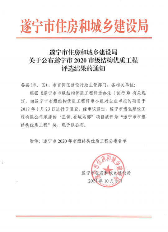 恭喜遂寧“正黃·金域名邸”項目被評為“遂寧市2020市級結構優(yōu)質(zhì)工程”獎稱號。